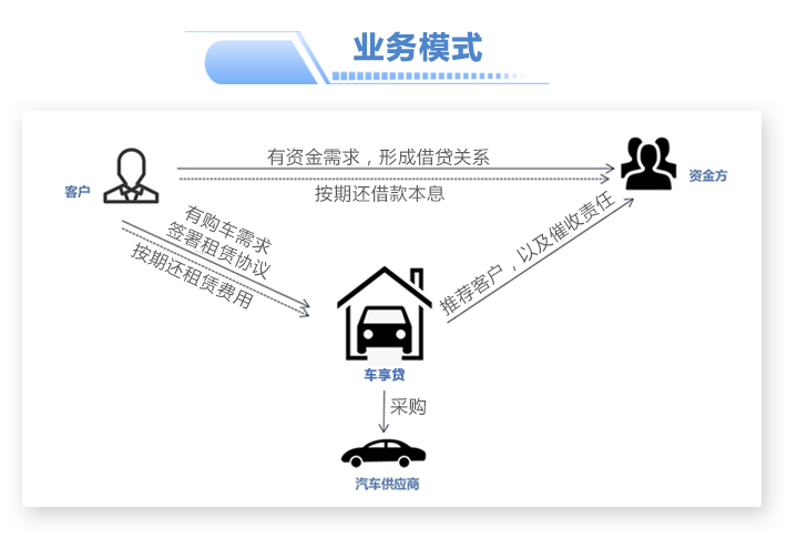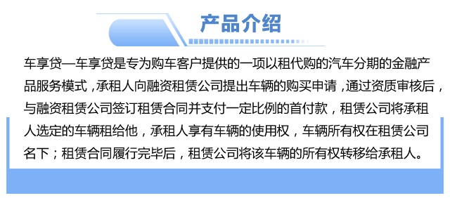 车享贷是通过以租代购的形式实现客户分期购车的一种贷款模式,在租赁期间,客户享有车辆使用权,车辆的权属将作为担保物,上牌在租赁公司名下,借款客户租赁期满后,租赁公司将车辆权属转移至借款客户名下。