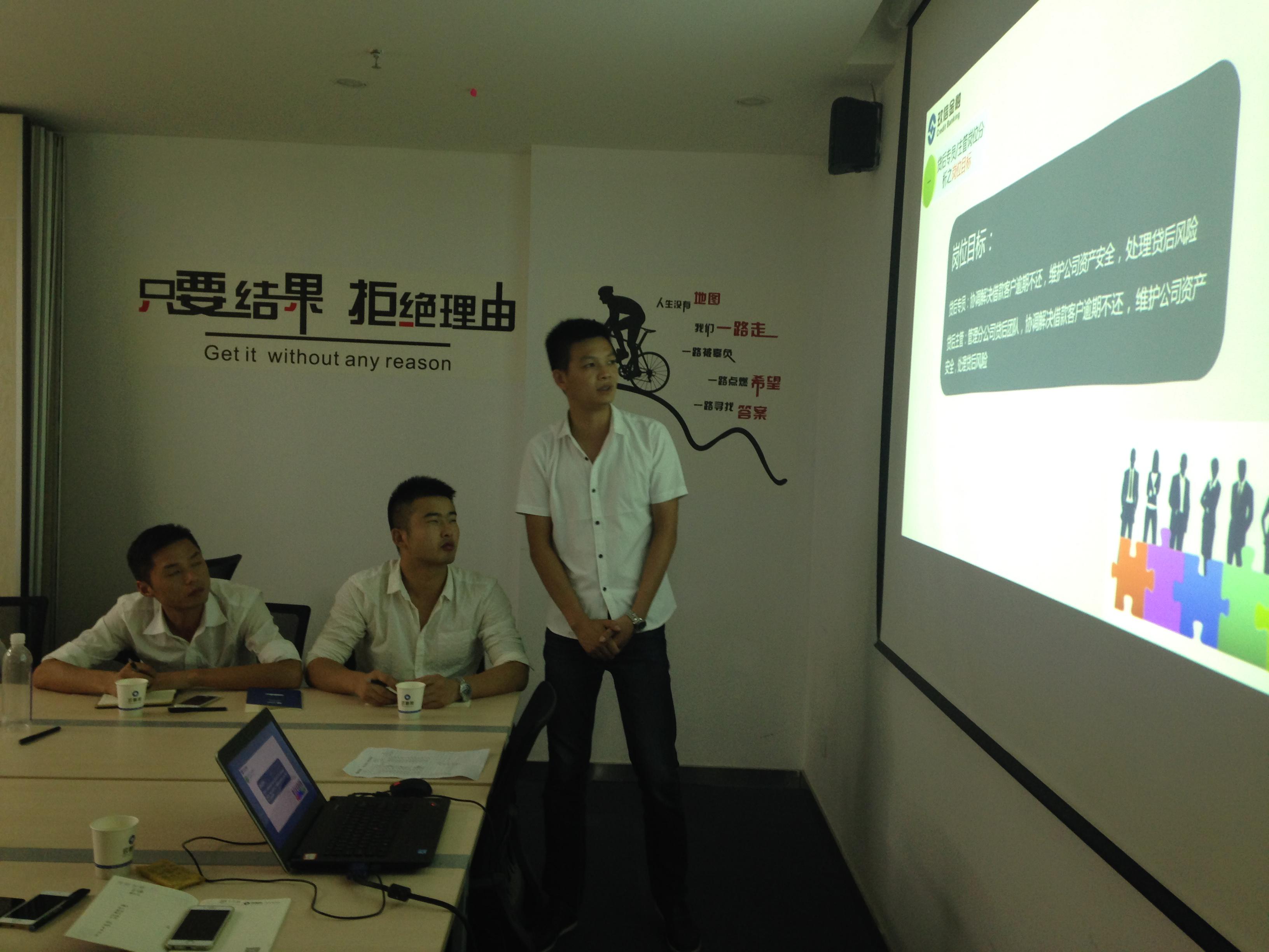 培训第二天,各门店副理及贷后主管逐一完成的门店的工作述职汇报。主要是对前期的工作总结、后期工作计划,以及平时工作中的一些问题和经验的分享。同时,述职现场针对门店反馈的问题做解答,讨论解决方案,优化工作方法,完善工作流程。